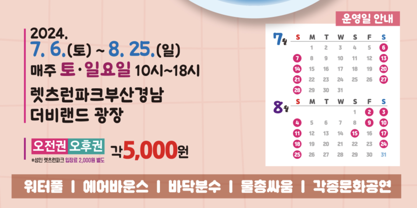 8월 2일(금) ~ 8월 11일(일) 2주간 금/토/일 3일 운영, 8월 15일(목) 추가 운영 - 장소 : 렛츠런파크 부산경남 더비랜드 광장