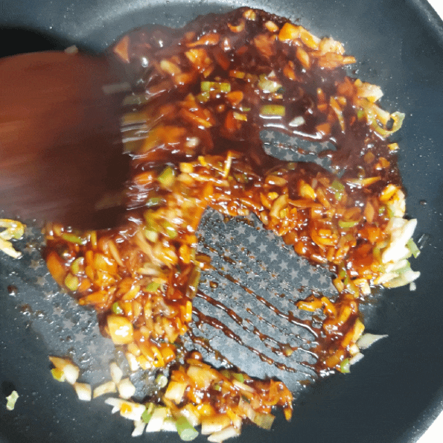 - 팬에 기름을 두르고 다진 마늘을 넣어 볶아 향을 내주세요. 그 다음, 썰어놓은 양파와 대파를 넣고 볶아줍니다.