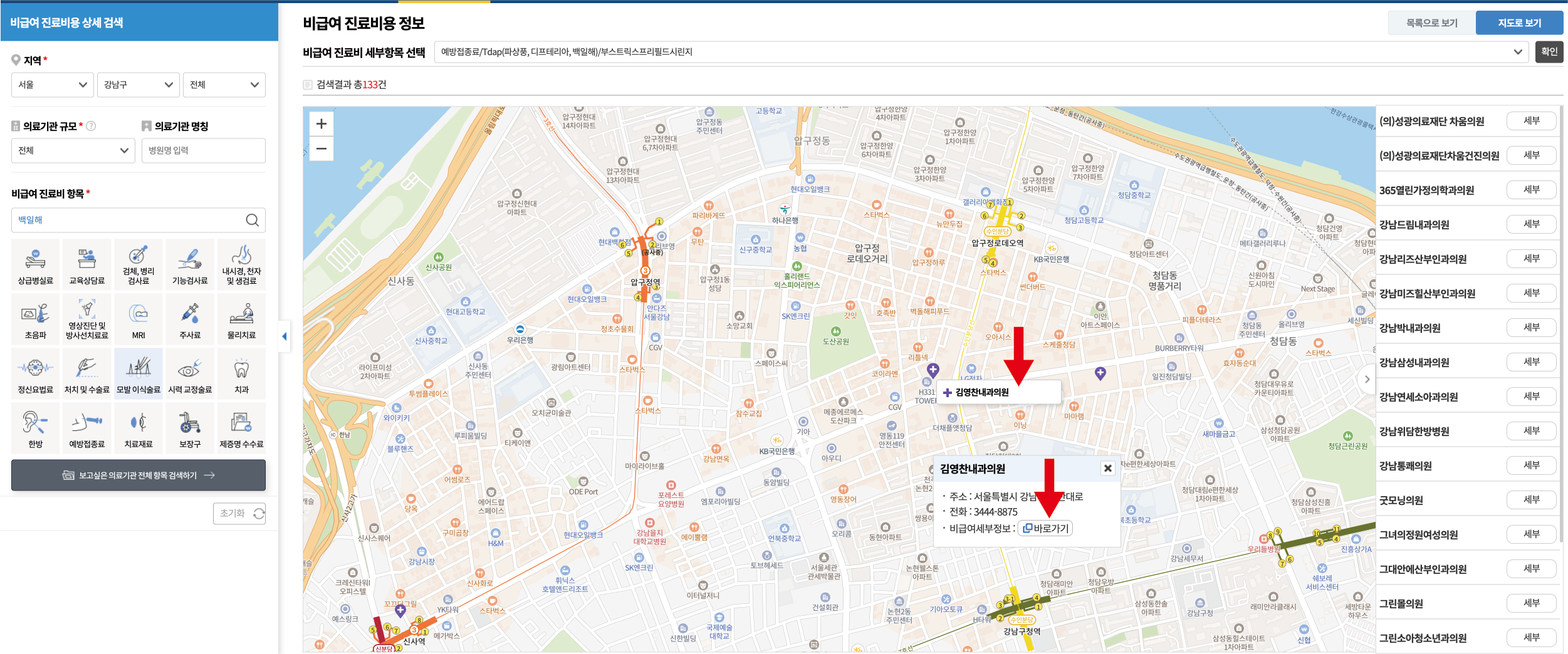 - 저는 편의상 강남구로 검색했습니다. 원하시는 거주지 근처 병원 선택하셔서 바로 보기 클릭하시면 진료비 정보를 볼 수 있습니다.