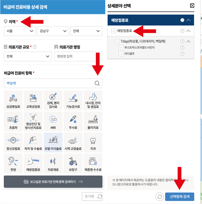 - 지역/ 비급요 진료비 항목에서 '백일해' 타이핑 후 검색/ 다음 예방접종료 체크/ 선택항목 검색