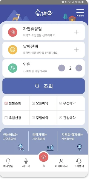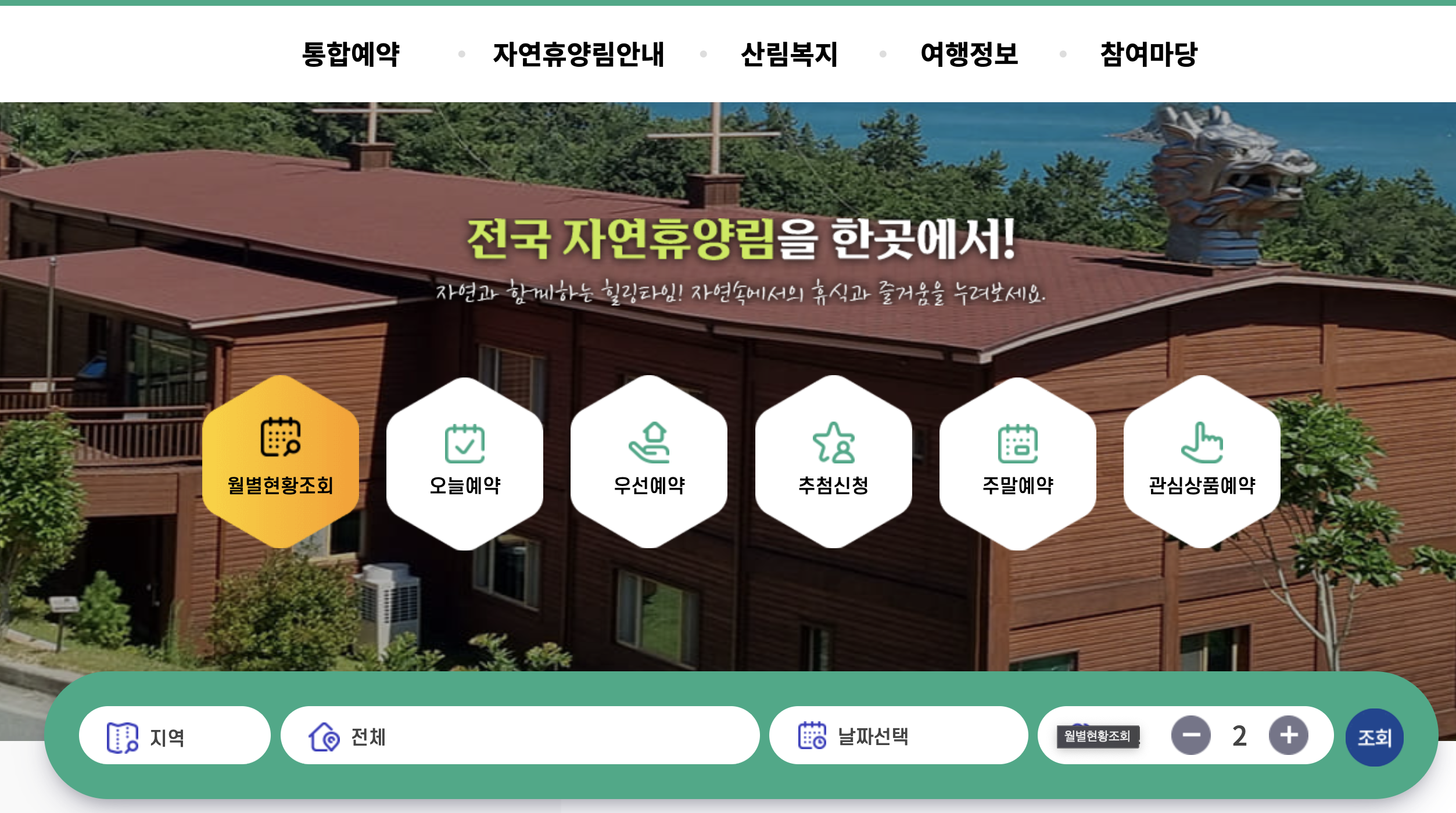 - 메인 페이지에서 원하는 지역, 자연휴양림 명칭, 날짜, 인원을 입력한 후 조회를 클릭합니다.
