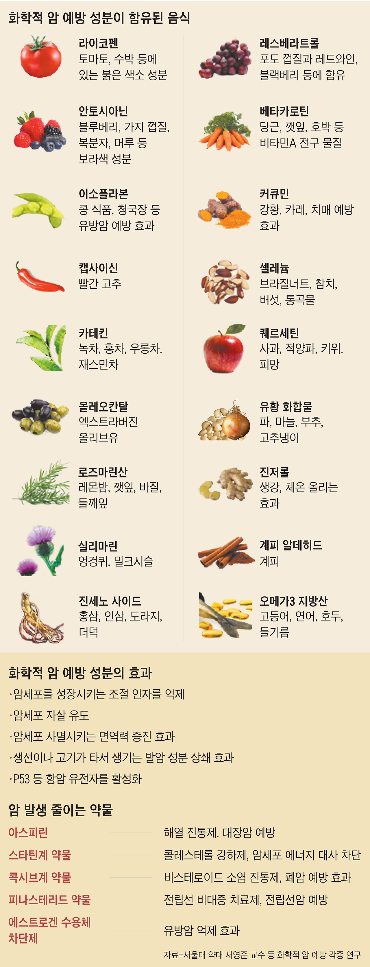 항암 식품의 리스트와 효능을 정리한 이미지입니다.