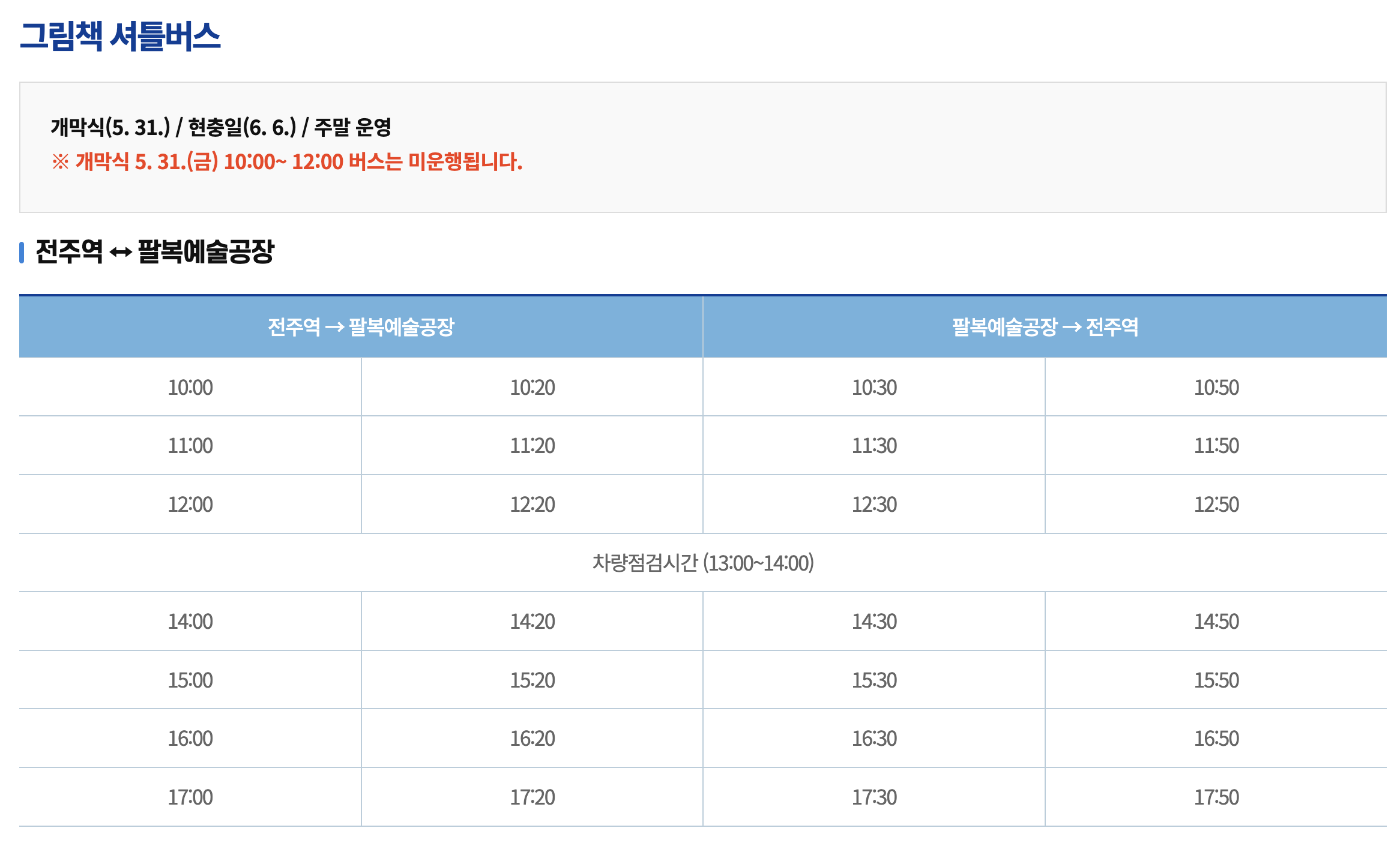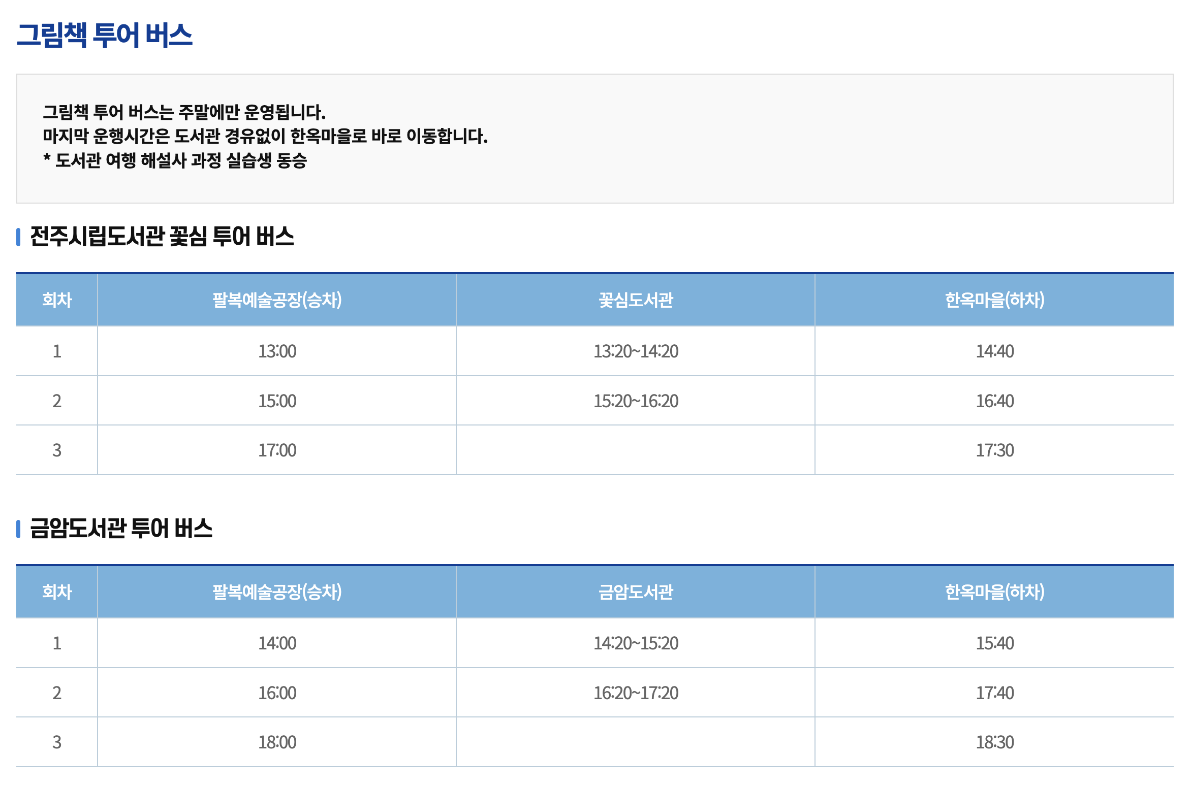 Q: 셔틀버스는 어떻게 이용할 수 있나요?A: 셔틀버스는 전주역, 고속버스 터미널, 시외버스 터미널, 한옥마을 등 주요 지점을 연결하여 운영됩니다. 주말에는 도서관 여행 해설사 과정 실습생이 동승하는 그림책 투어 버스도 운영됩니다.