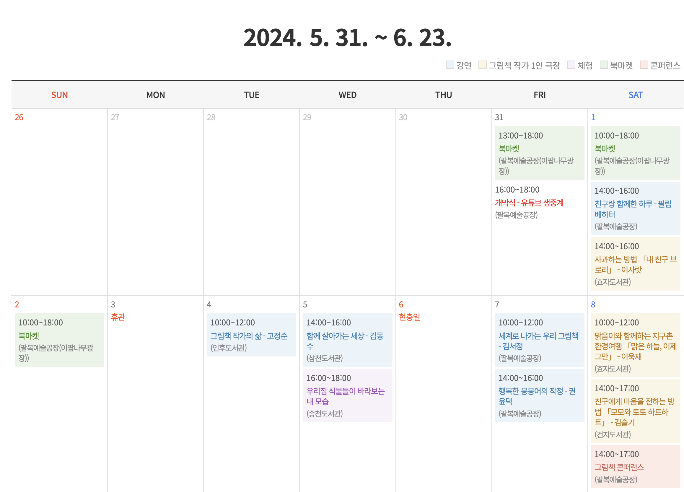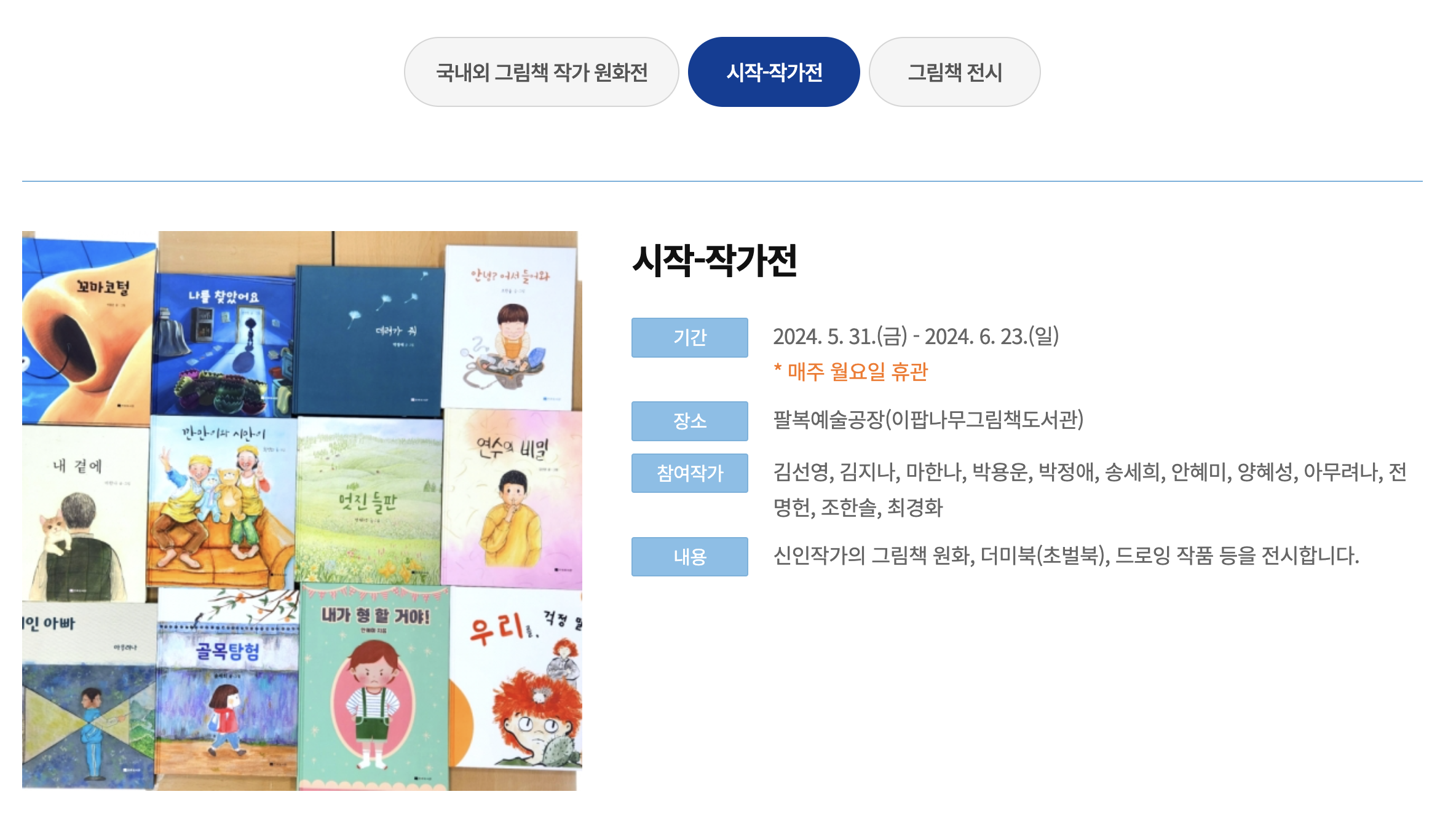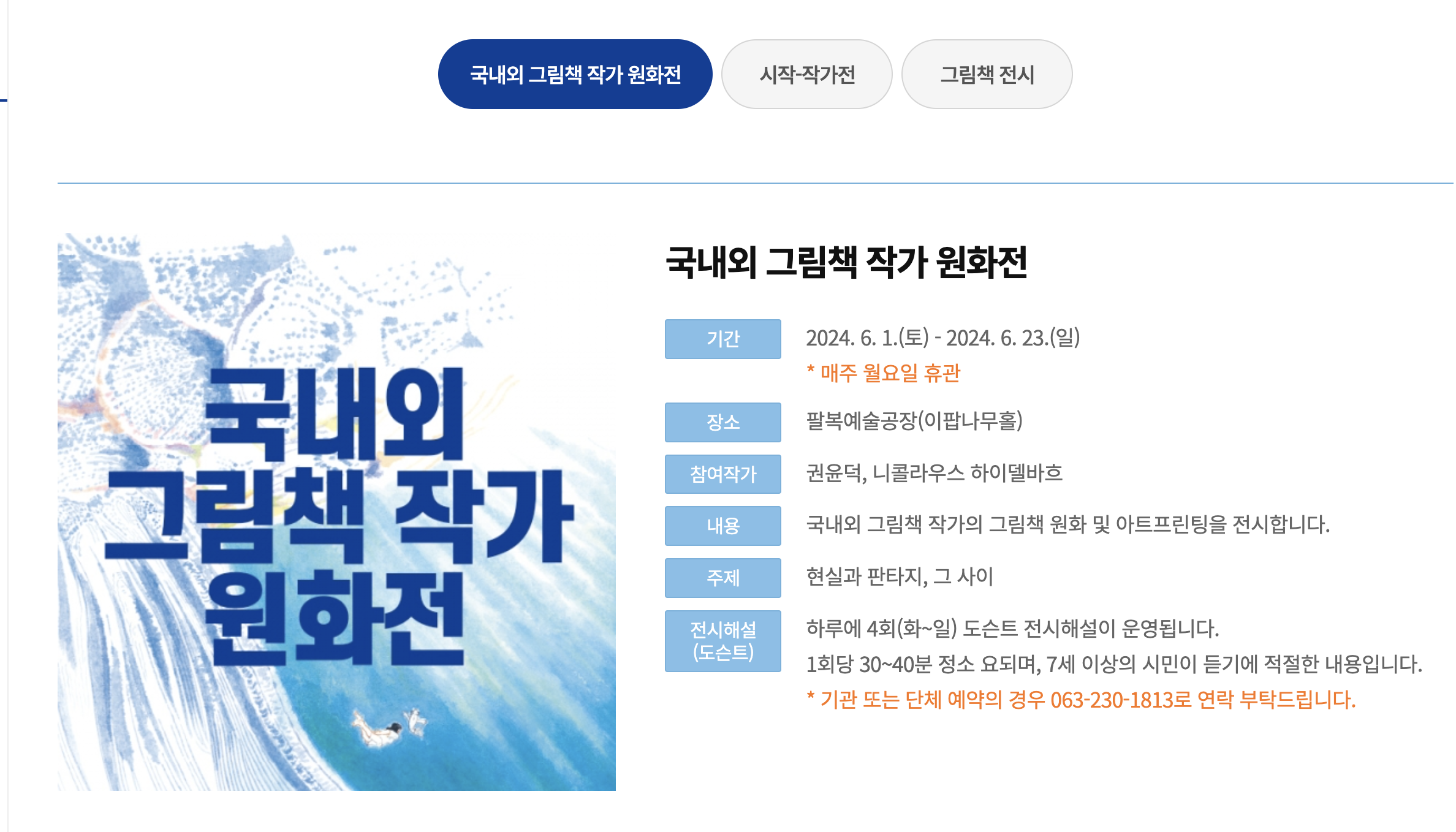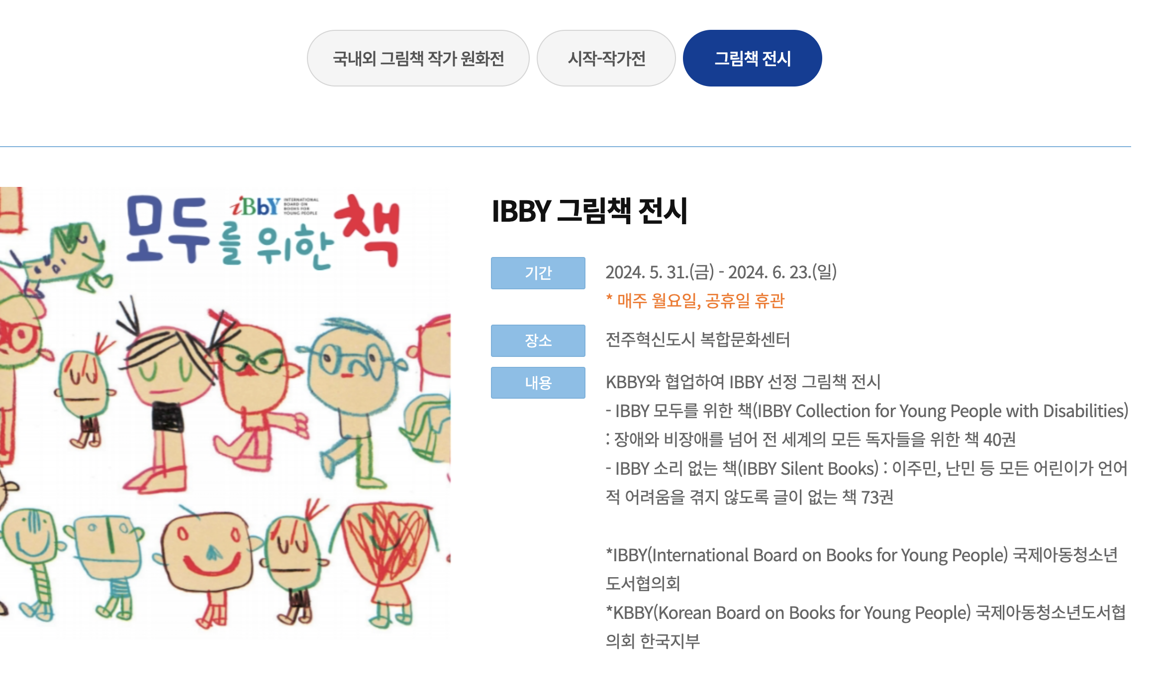 - 전시 : 국내외 그림책 작가 원화전, 시작-작가전, 전주의 시선 그림책전등