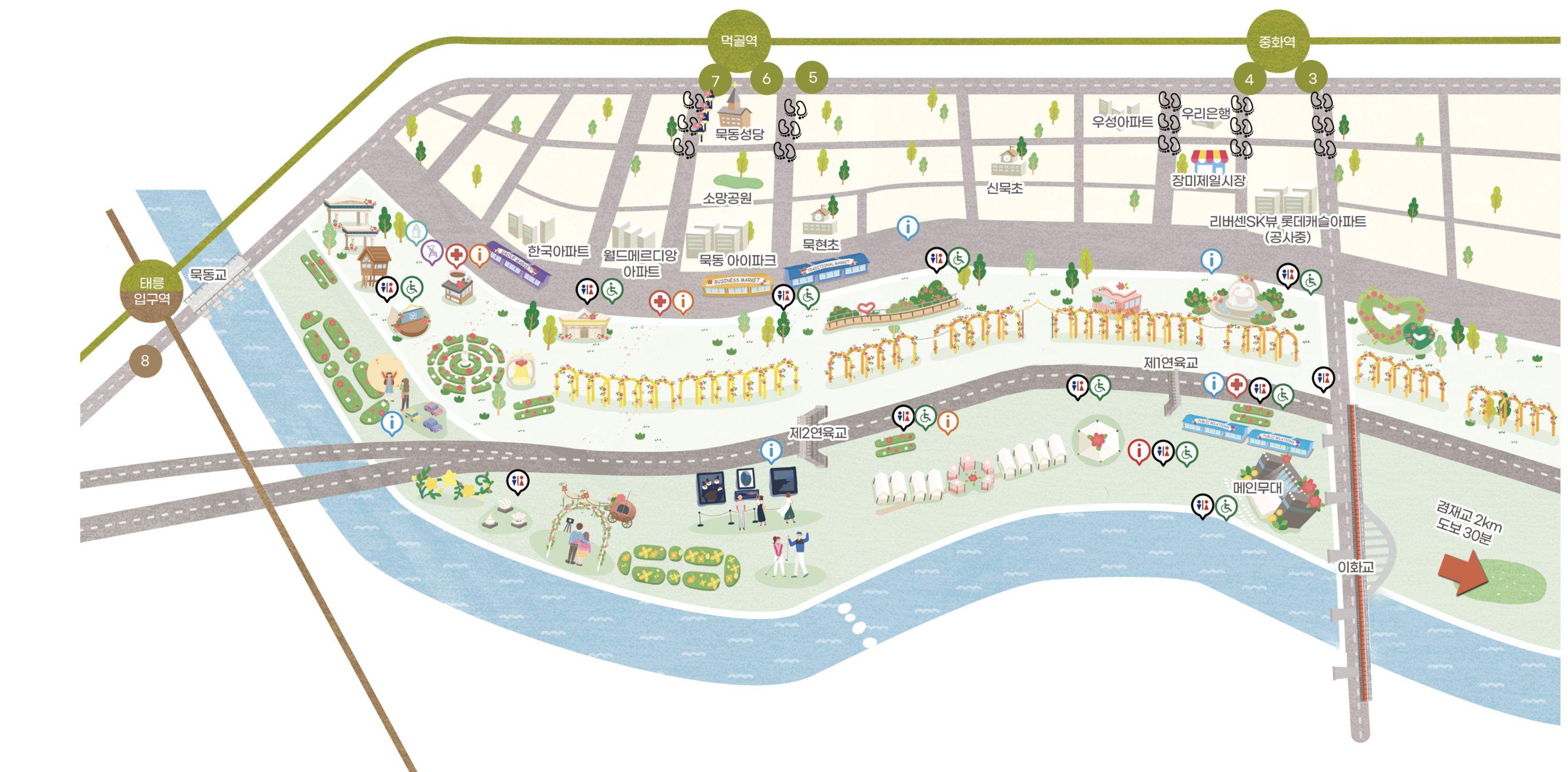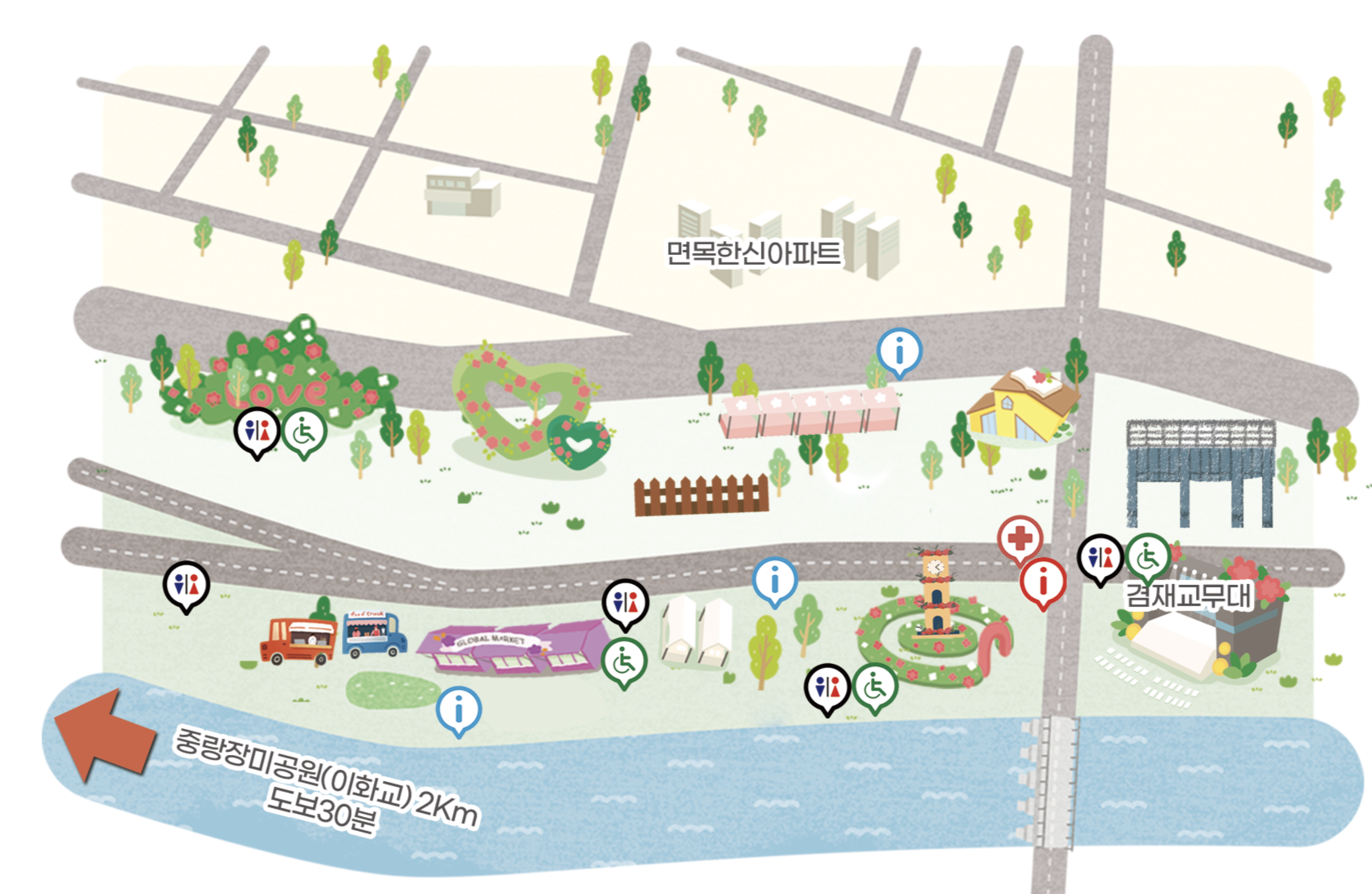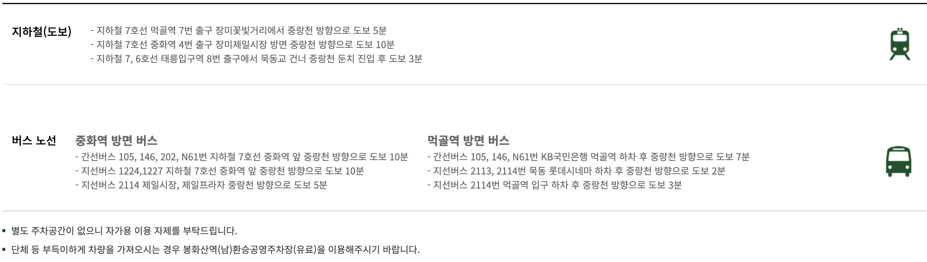 - 중랑 서울장미축제는 주차공간이 협소 하므로 대중교통을 이용해 주세요.