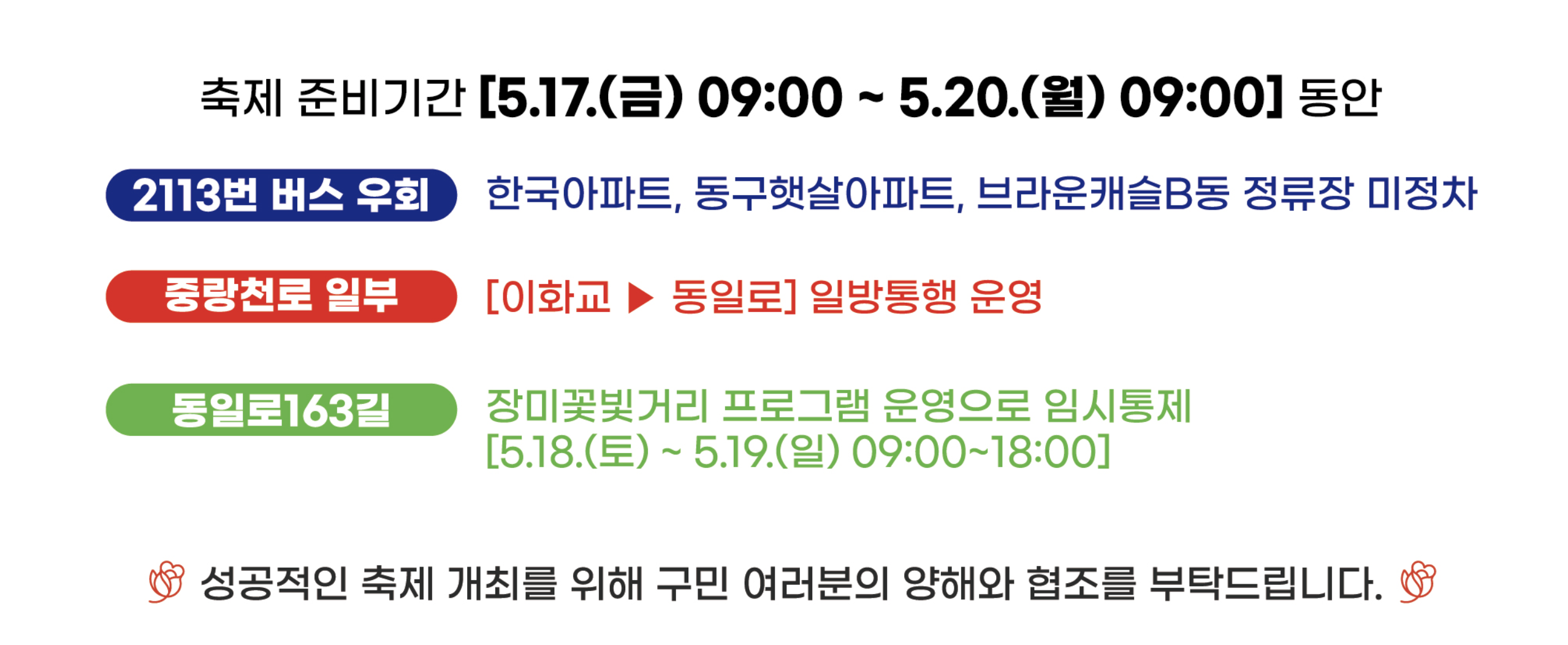 - 축제 기간 ‘중랑장미주간’ 선포, 지역 상권 및 문화행사와 연계하며 관광객 적극 유치